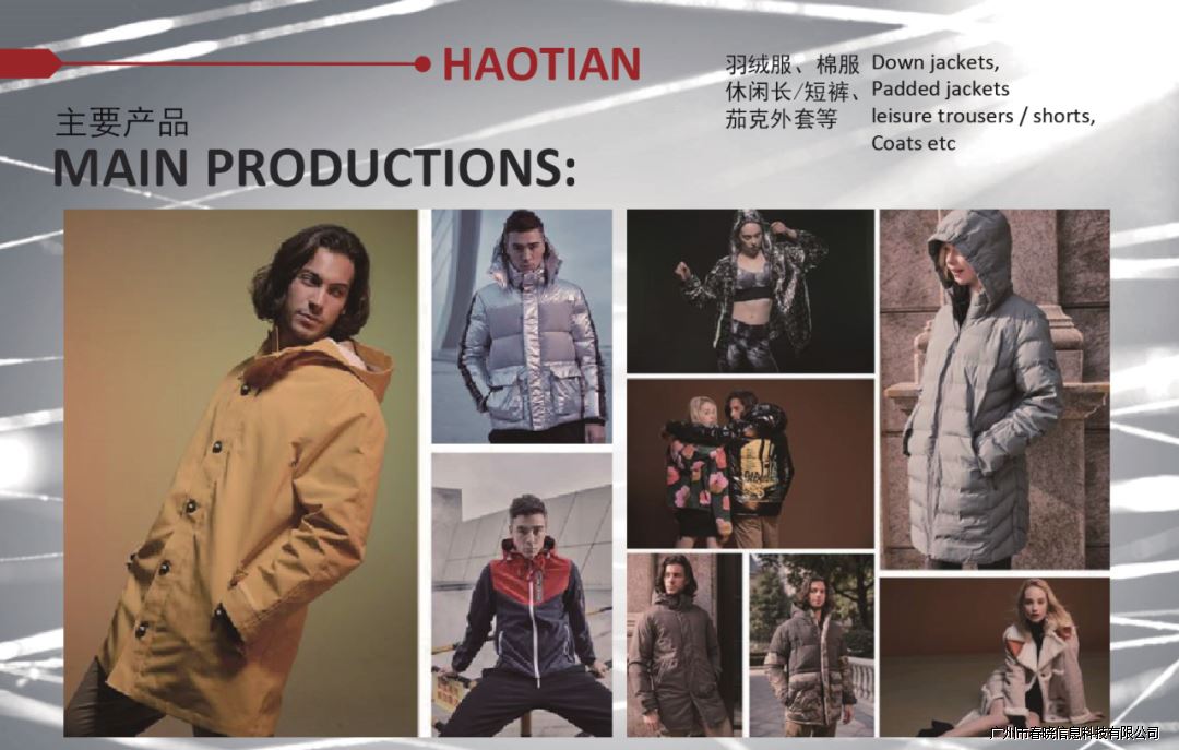 南京昊天制衣是江苏华利达集团的合资子公司之一,公司主营业务为梭织服装,目前是国内最大的羽绒服加工型企业,现有生产线30余条和一个多功能水洗车间,员工2000余人,是目前南京市区域内规模最大的服装生产厂家之一,合作的客户包括:优衣库、波司登、菲乐、沃尔玛、H&M、361等。