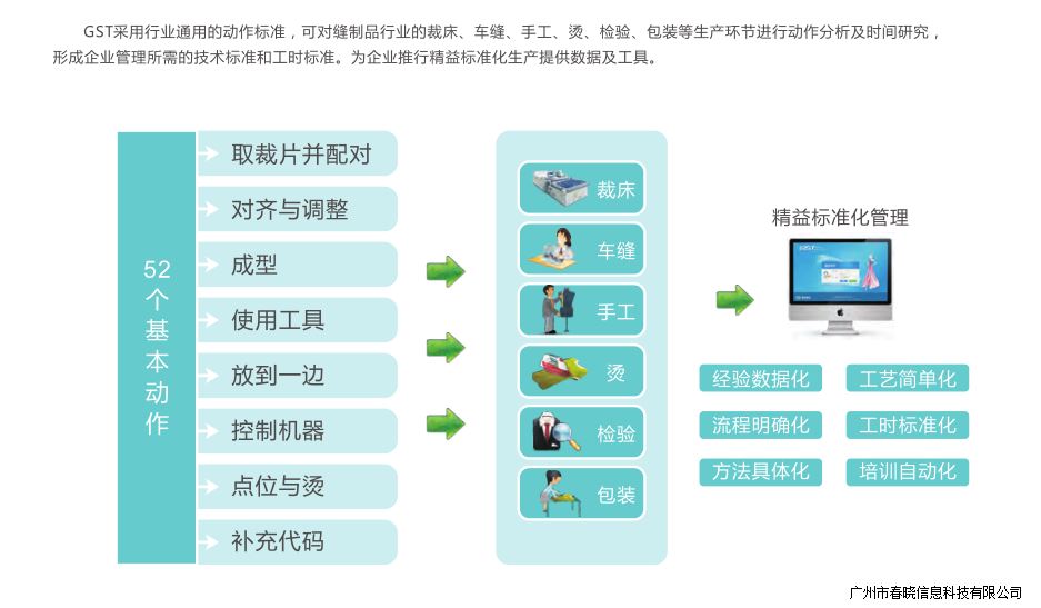 昊天制衣通过引进j9娱乐GST标准化管理系统,实现工时标准化、优化生产工艺流程、实现管理精细化,为业务发展提供更加有力的支撑,发挥业务板块与实业板块之间的桥梁纽带作用。绿色生产,公司把传统产业优势和转型升级结合起来,对客户每一项新需求,新概念,新想法快速作出反应。通过GST标准,将全面管理公司的各种工艺技术标准,以及建立完善的标准工时核算和应用体系,进一步通过对技术人员(IE人员)、管理人员的GST分析培训,逐步深入标准化的应用,推进标准化,自动化,可视化,信息化改善,充分发挥信息技术在生产过程中的作用。